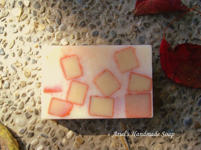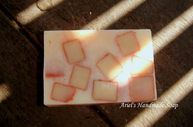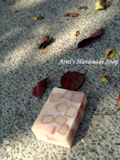 接下來說說塊皂吧!這是塊去角質皂,基本油品為山茶花油、荷荷巴油、椰子油及棕櫚油。中間的皂塊是榛果甜杏仁母乳皂,裹上粉紅石泥粉。比較特別的是皂中去角質顆粒是用我的「肌膚之鑰」身體去角質霜30ml,肌鑰的去角質顆粒非常細緻,小小的圓形顆粒不會傷害肌膚產生刮痕,所以如果你是極敏感的人可以用這塊皂,非常溫和,中間的榛果甜杏仁母乳皂同時會讓你感到很滋潤,去完角質也不會覺得乾澀不舒適。