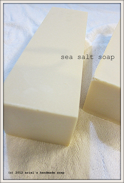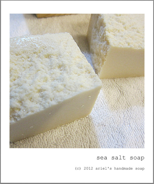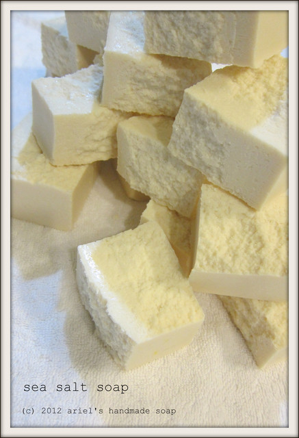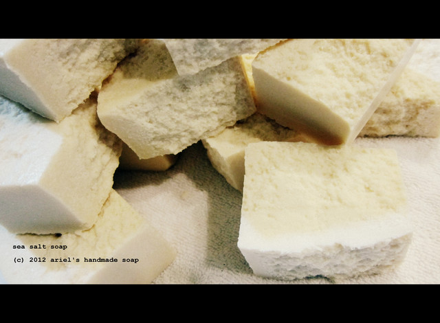 我大概是做鹽皂做上癮了,尤其是喜歡切皂時鹽皂不規則的崩裂,小小的顆粒混和著皂屑一起掉落。上一批的鹽皂在放了三個月以後,變得格外地好洗,50%椰子油起泡度沒有像100%的優,但是多加些水多搓幾下,細緻的泡泡就會跑出來囉!