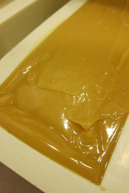 倒入油後,產生許多的小泡泡,而且很快就trace,趕緊到入模,就深怕稍慢幾秒整個皂液凍結在鍋中,就悲劇了。